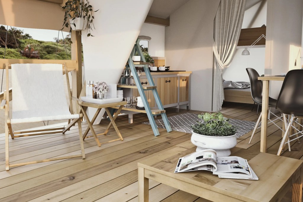 אוהל סנדי מיוחד מיפני שבניגוד לשאר הדגמים היסודות שלו לא משלבים ברזל, וקונסטרוקציית העץ בעלת מראה יותר דומיננטי, מה שנותן לתמונה הכללית של האוהל מראה יותר קליל, יכול להתאים ביופיו בכל מקום, ובעיקר בים